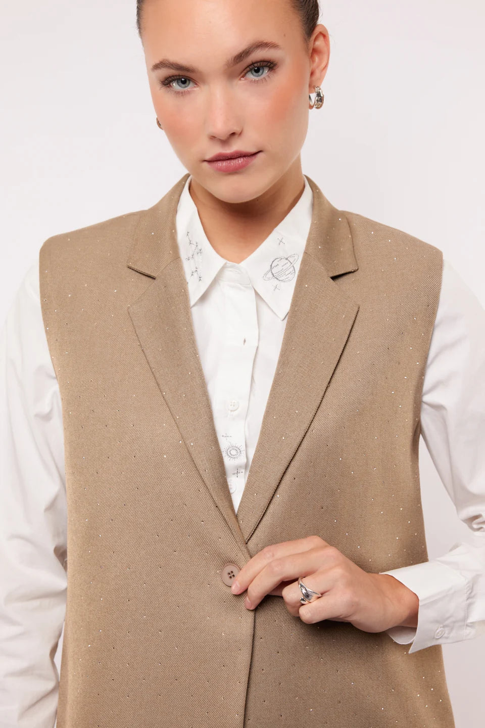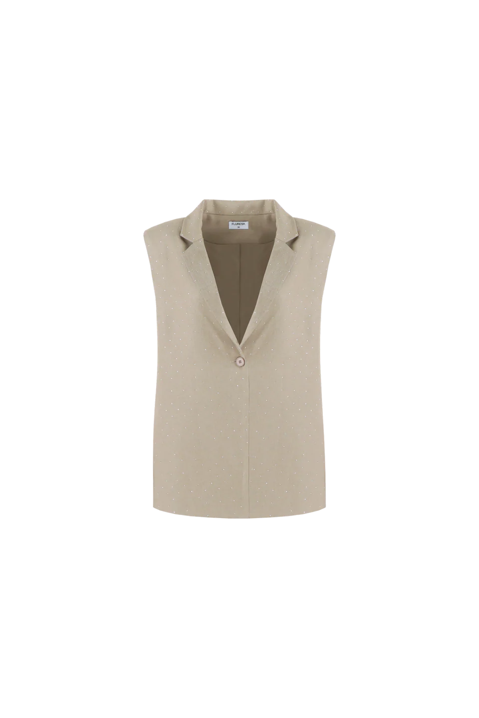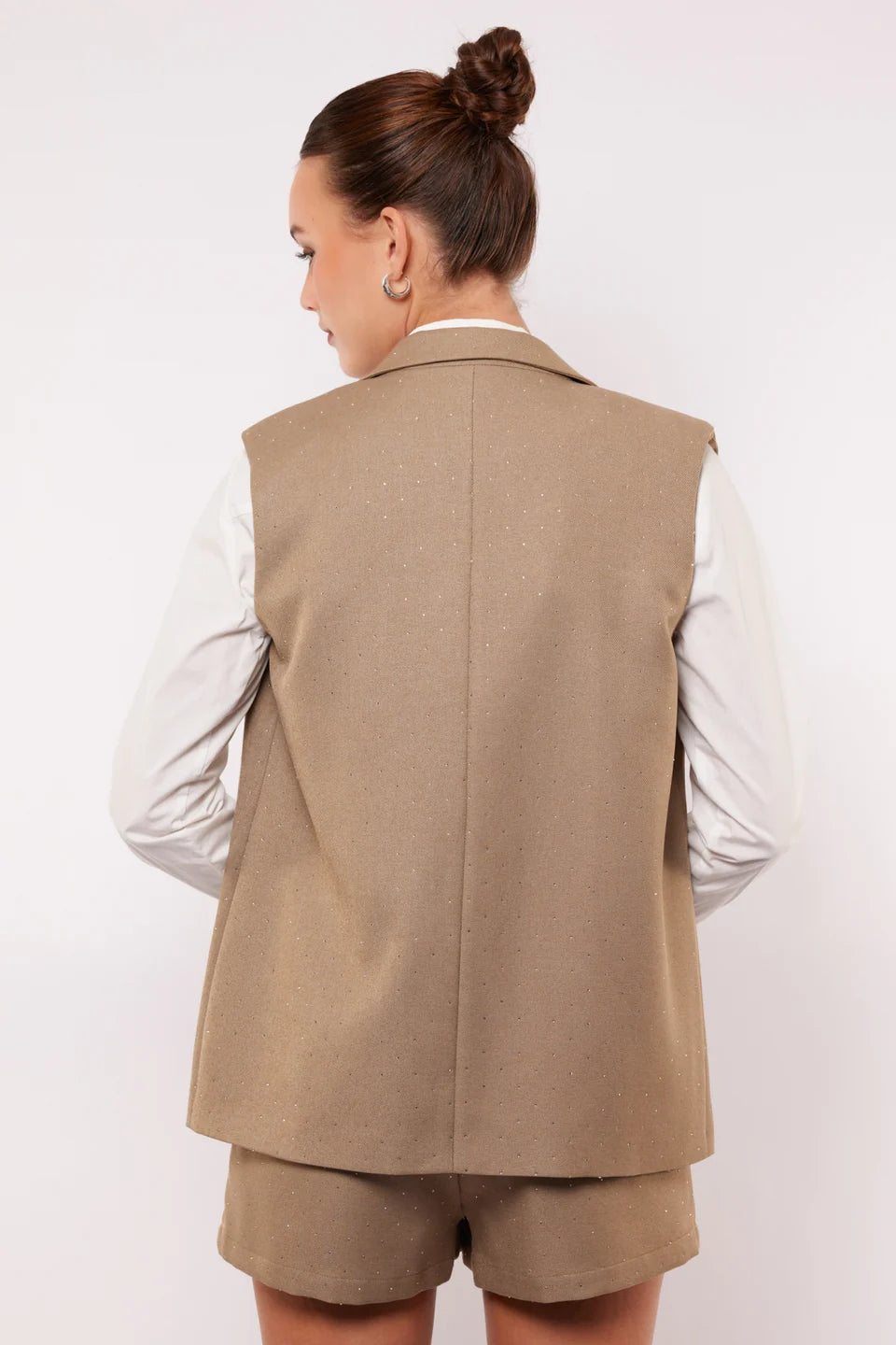 Say hello to sparkle! De JOELLE GILET is een classy gilet met een speelse twist dankzij de subtiele glans in de stof. Het mouwloze design en de nette kraag zorgen voor een krachtige look. Combineer met de YELENA SHORTS voor een coole two-piece met flair.