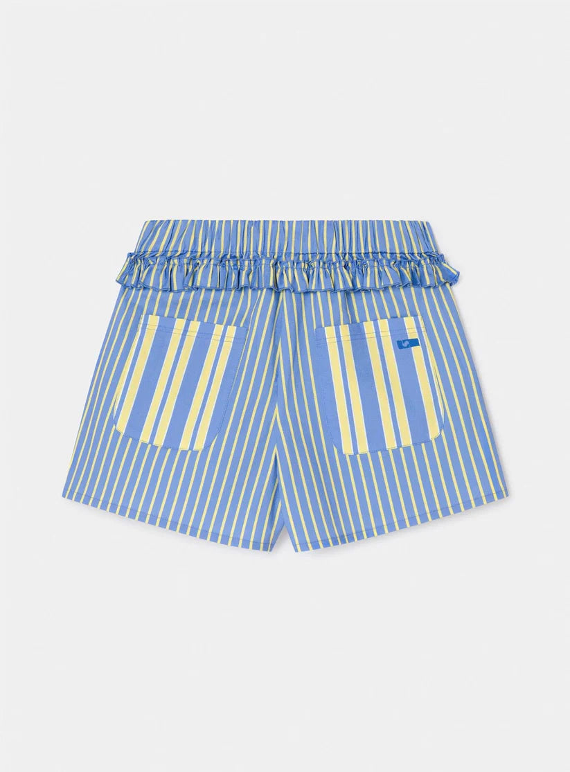Blauw shortje met witte strepen. Het item heeft ruffles om de tailleband.